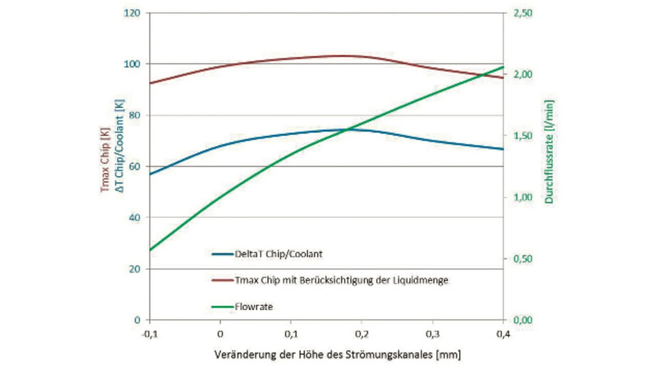 Als weitere Variationsmöglichkeit betrachteten wir, wie der Querschnitt des Strömungskanals den Druckverlust und die Entwärmungsleistung beeinflusst. Dazu legten wir den Druckverlust mit konstant 0,17 bar fest, der zu dem gewünschten, maximal zulässigen Druckverlust im Automotive-Bereich noch eine Reserve lässt. Dann veränderten wir die lichte Höhe des Strömungskanals und damit die Gesamthöhe des Kühlers in Schritten von 0,1 mm und ermittelten jeweils den Temperaturunterschied ΔT des Chips zur mittleren Kühlmitteltemperatur sowie die Durchflussrate.