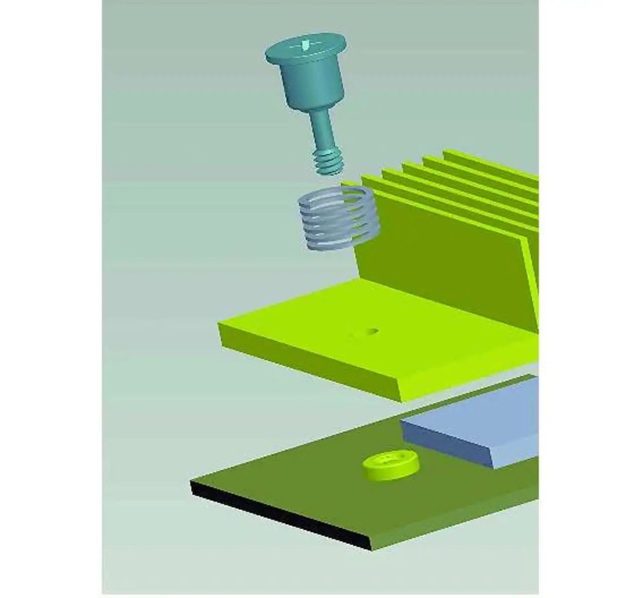 Bei der Handhabung schwererer Kühlkörper nutzt man oft Befestigungselemente mit Federn, um die Belastung zu begrenzen. Eine Möglichkeit ist der Einsatz einer einfachen, von einer Feder umgebenen Passschraube, die durch den Kühlkörper hindurch geführt wird und die Feder mit einer definierten Kraft auf die Oberseite des Kühlkörpers presst. Die Passschraube wird mit einer Mutter auf der anderen Seite der Leiterplatte befestigt. Dieses Verfahren erlaubt aber ein zu starkes oder zu schwaches Festziehen, sodass ein falscher Anpressdruck die Wärmeübertragung beeinträchtigen kann.