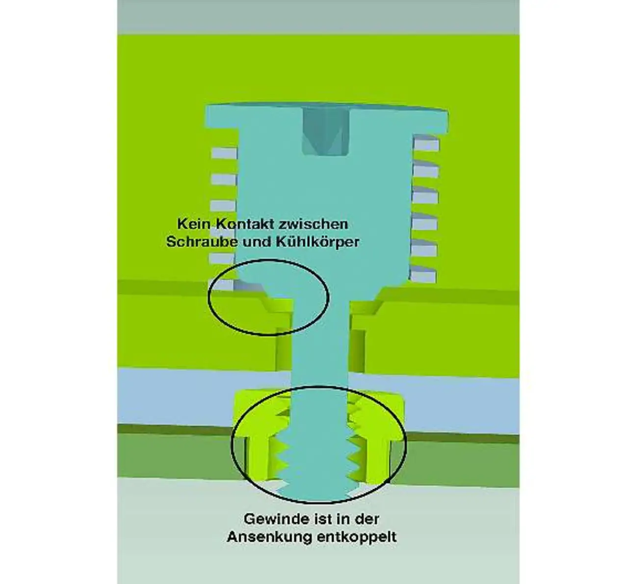 Diese Konfiguration gewährleistet, dass der Kühlkörper durch die vorgespannten Federn auf den Schrauben an jedem Befestigungspunkt gleichmäßig mit einer vordefinierten Klemmkraft belastet wird.