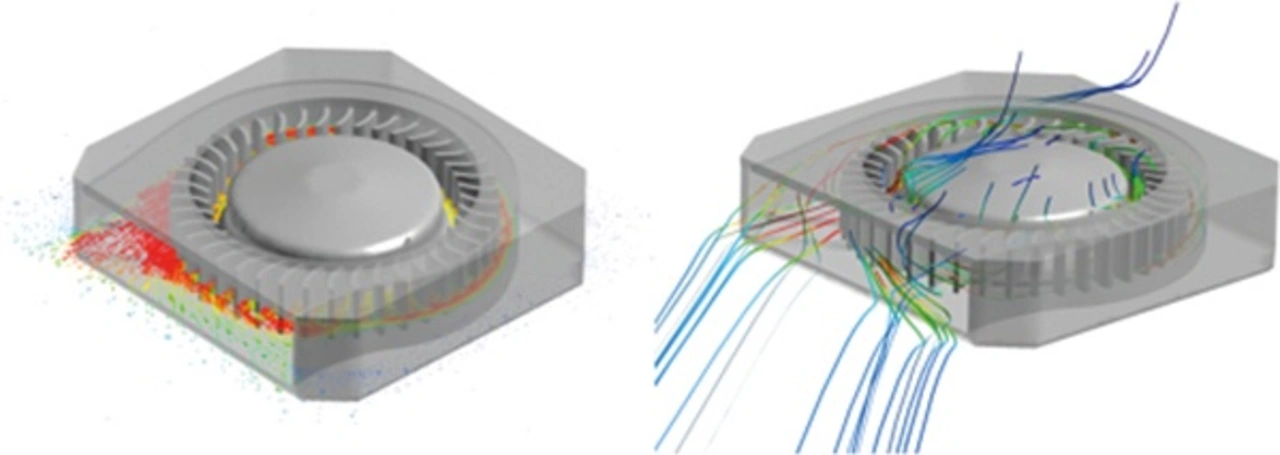 Ein wichtiges Werkzeug zur Geräuschoptimierung sind Simulationen. Sie helfen, den Luftschall zu reduzieren und die Effizienz des Systems bereits vor dem Prototypenbau zu verbessern. Diese sollten stets vom Hersteller durchgeführt werden, da nur dieser die exakte Schaufelgeometrie seiner Lüfter kennt. Ohne diese Daten lässt sich der Ausströmungsbereich lediglich grob abschätzen. Dabei ist gerade der Luftaustritt entscheidend, um beispielsweise die Form und Orientierung des Kühlkörpers zu bestimmen oder die Schaufelgeometrie an ein bestehendes System anzupassen.