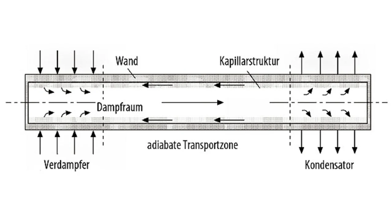 Ermöglicht wird dieses Leitungsverhalten durch einen zweiphasigen Wärmetransport. Während in einem Vollmaterial die Wärmeleitung über Gitterschwingungen und Ladungen erfolgt, ist die Heatpipe ein evakuiertes, mit einer kleinen Menge Flüssigkeit befülltes Kupferrohr (Bild 1). Wenn die Heatpipe an einer Seite erwärmt wird, verdampft an dieser Stelle das Arbeitsmedium und der Dampf steigt zum kalten Ende, wo er kondensiert. Dampf kann schneller größere Mengen Wärme transportieren als ein Feststoff. Der kondensierte Dampf, nun wieder als Flüssigkeit, muss vom kalten Ende zurück zum heißen Ende transportiert werden, damit der Kreislauf erhalten bleibt.