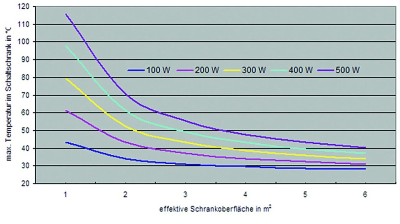 In diesem Beispiel beträgt die Innentemperatur des Schaltschranks +43,9 °C und liegt damit etwas über dem empfohlenen Bereich von +35 °C bis +40 °C. Somit ist der Schrank über eine aktive Klimatisierung zu entwärmen. Deren Nachteile lassen sich vermeiden, wenn ein etwas größerer Schrank gewählt wird: Hätte dieser die Abmessungen 1000 mm × 2000 mm × 600 mm, ergibt sich unter identischen Aufstellungs- und Umgebungsbedingungen eine effektive Schrankoberfläche von 6,60 m² und damit eine maximale Schaltschrank-Innentemperatur von +38,8 °C. Nun liegt der Wert innerhalb des empfohlenen Temperaturbereichs. Damit wäre eine kostengünstige, rein passive Entwärmung über die Schrankoberflächen möglich.