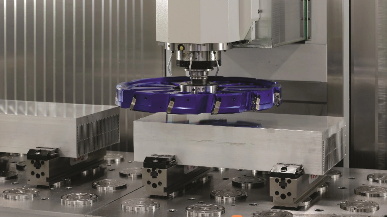 Für Halbleiter-Montageflächen, bei denen die Fräsbahnen nicht vorhanden sein sollen beziehungsweise dürfen, empfiehlt es sich, die Bearbeitungszeichnung dementsprechend zu spezifizieren bzw. die Fläche der Bauteilposition besonders anzugeben. Zur Erzeugung einer planebenen Halbleitermontagefläche ohne Fräsbahnen ist ebenfalls eine innovative Maschinen- und Werkzeugtechnik gefragt. Messerköpfe bzw. Fräser mit einem großen Durchmesser für das Planfräsen von sehr breiten Hochleistungskühlkörpern sind nicht von der Stange erhältlich, sondern speziell für eine geeignete CNC-Maschine entwickelt und hergestellt worden (Bild 4).