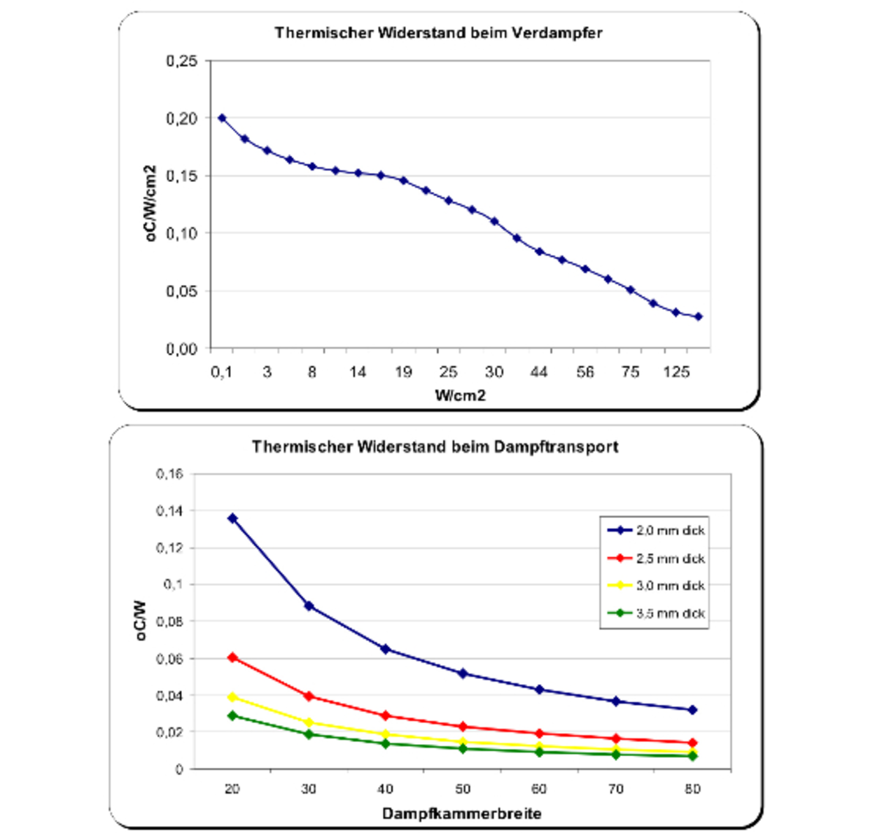 Der thermische Widerstand beim Dampftransport lässt sich ähnlich ableiten. Er hängt jedoch vom Querschnitt des Dampfsystems ab und ist abhängig von der Temperatur und der Art des Fluids. Die gezeigten Werte sind typisch für wassergefüllte Dampfkammersysteme und gelten für Temperaturbereiche bei Elektronikkühlungen. Der Widerstand beträgt üblicherweise 0,01 K/W/cm2. Bild 2b verdeutlicht seine Abhängigkeit von der Dicke (2,0 mm bis 3,5 mm) und der Breite (20 mm bis 80 mm) der Dampfkammer. Die Leistungsgrenzen bei passiv gekühlten Systemen wurden in [3] diskutiert.
