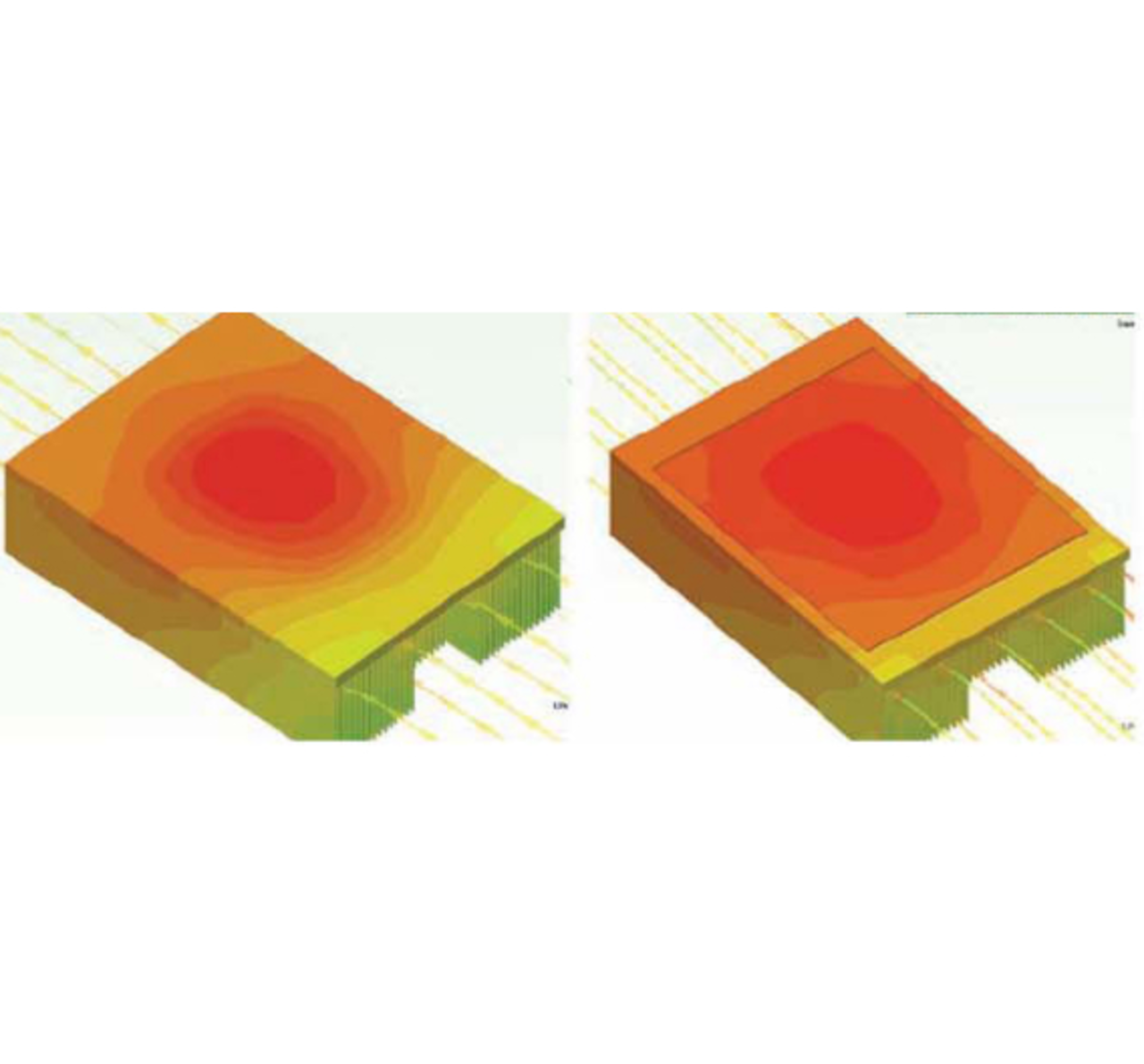 Eine Simulation verdeutlicht die unterschiedlichen Wärmeverteilungen bei einem einfachen Kupferkühlkörper im Vergleich zur viel homogeneren Verteilung bei identischem Kühlkörperlayout, aber mit integrierter Dampfkammer (Bild 3).