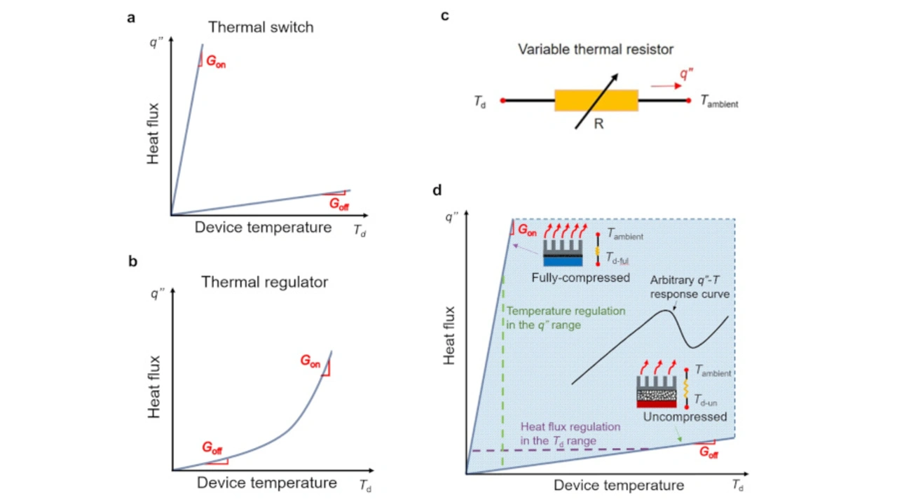 Etliche Forscherinnen und Forscher haben verschiedene Formen von Thermoschaltern vorgeschlagen, die sich einschalten lassen, um Wärme abzuführen, oder ausschalten lassen, um die Wärme im Inneren zu halten. Da diese Systeme jedoch entweder komplett ein- oder ausgeschaltet sind, können sie sich nicht flexibel an wechselnde Temperaturen sowohl innerhalb als auch außerhalb des Geräts anpassen. Die nun vorgeschlagene Lösung stammt von der Postdoktorandin Tingting Gu sowie den beiden Masterstudenten Zixin Xiong und Luis Delgado, unterstützt von Xiulin Ruan und Amy Marconnet, außerordentliche Professorin für Maschinenbau.