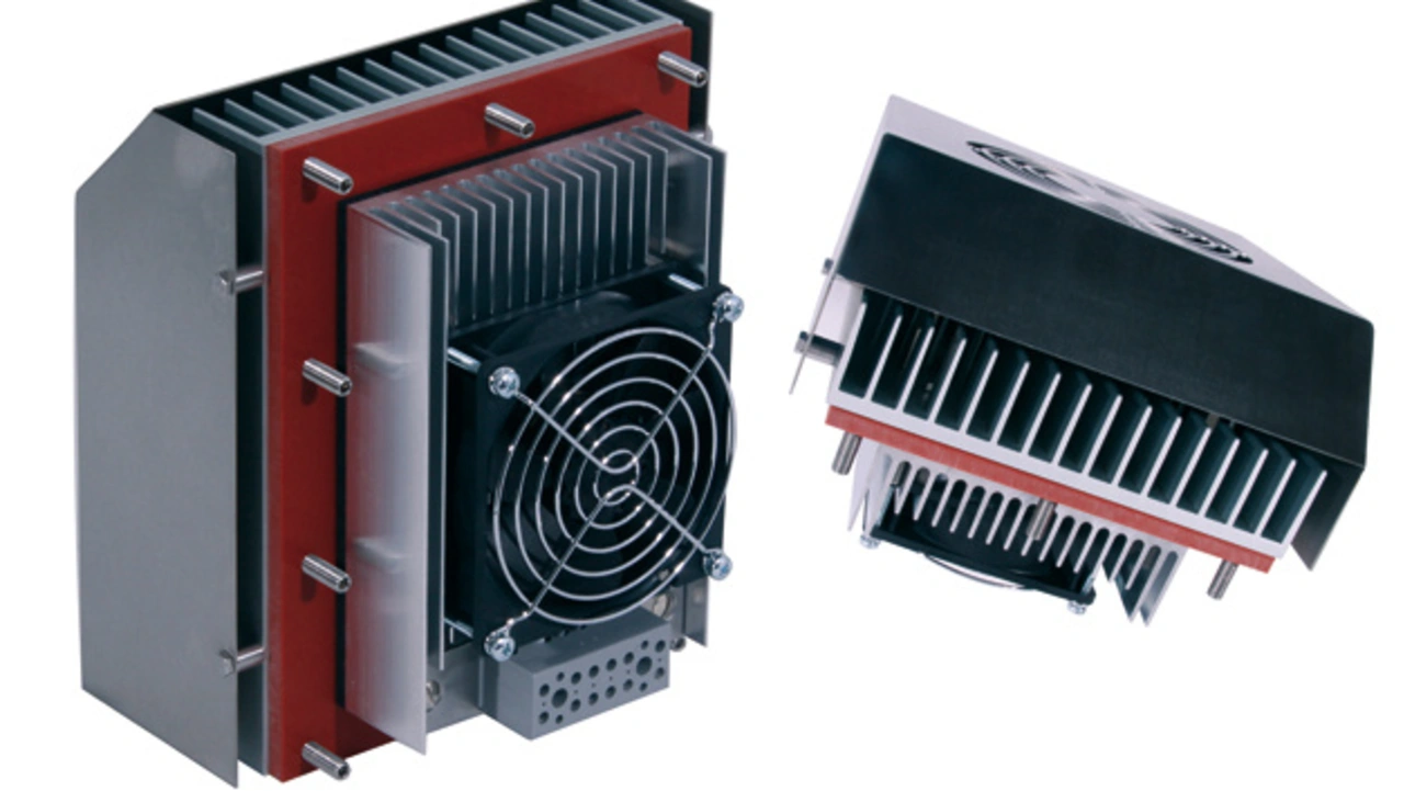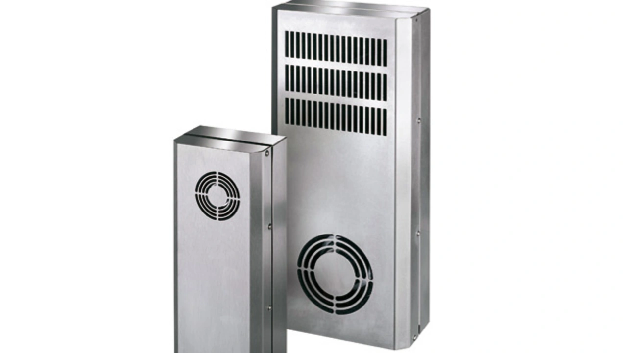 Die PM-Kühlgeräte arbeiten an 24 VDC und erreichen die Schutzart IP55. Der zweiteilige Aufbau des Edelstahlgehäuses ermöglicht de Außenanbau oder Teileinbau. Ein weiterer Vorteil des geteilten Aufbaus ist die thermische Trennung der Luftkreisläufe, die zu einer besseren Kühlung führt. Auf der 6-poligen Anschluss-Steckklemme sind Lüfter und Peltier-Elemente getrennt aufgelegt, sodass wahlweise der Heiz- und Kühlbetrieb ansteuerbar ist. In vielen Fällen kann dadurch auf eine zusätzliche Heizung verzichtet werden. Das 50-W-Gerät misst 293 x 120 mm bei Tiefe von nur 82 mm. Beim leistungsstarken 100-W-Typ sind es 430 x 195 mm bei einer Einbautiefe von 96 mm.