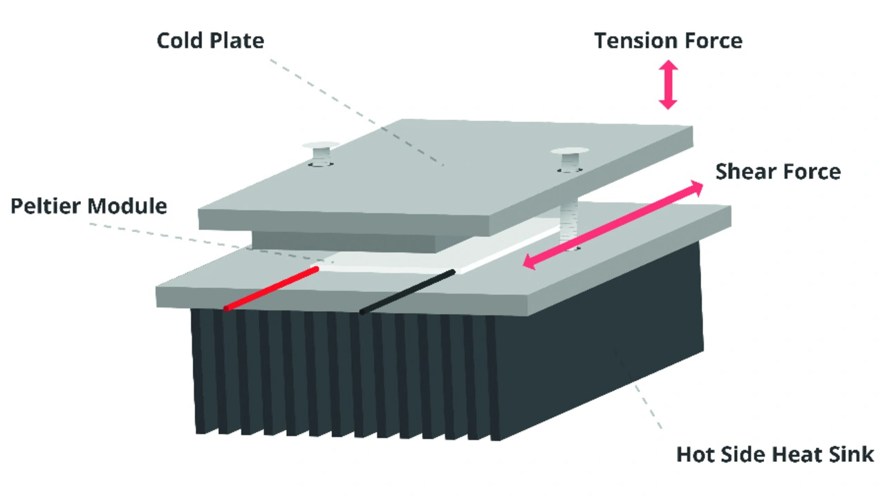 Der übliche Einsatz eines Peltier-Moduls beginnt mit dem Platzieren der kalten Seite auf einem zu kühlenden Objekt, gefolgt von einem Kühlkörper auf der heißen Seite, um die Wärme abzuführen (Bild 2). Dabei können große Scher- oder Zugkräfte über das Modul hinweg auftreten, sofern keine mechanische Struktur verwendet wird, um das zu kühlende Objekt und den Kühlkörper zu unterstützen. Werden das Objekt und der Kühlkörper einfach ohne zusätzliche Unterstützung an den Keramikplatten befestigt, kann das Peltier-Modul unter diesen Kräften brechen oder versagen (Bild 3).