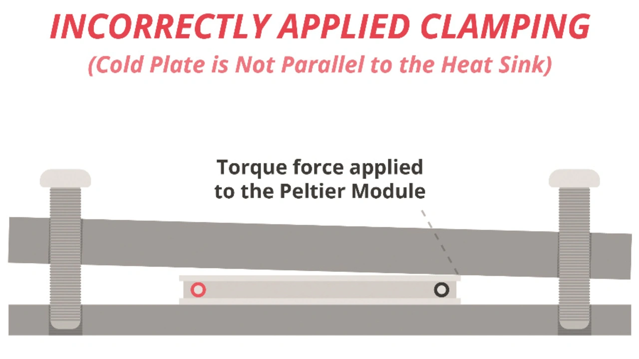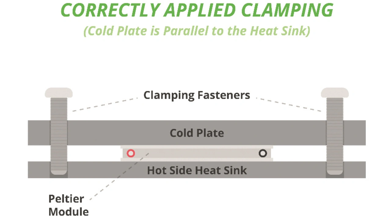 Da ein Peltier-Modul den großen Druckkräften von Klemmen standhalten kann, lassen sich Spannungen und Scherkräfte in vielen Anwendungen vermeiden, indem das Peltier-Modul zwischen dem zu kühlenden Objekt und dem Kühlkörper festgeklemmt wird. Dadurch können die Klemmen alle Scher- oder Zugbelastungen aufnehmen, die das Objekt und der Kühlkörper erzeugen.