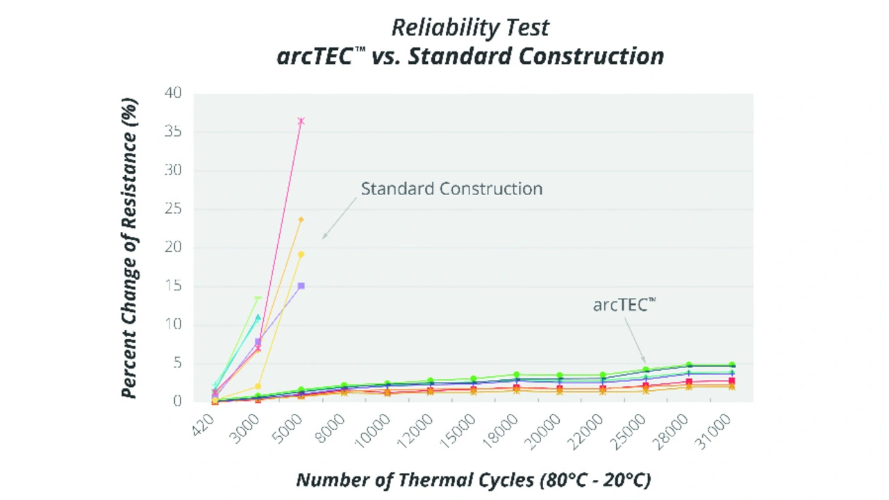 Durch Auftragen des elektrischen Widerstands über die Anzahl der Wärmezyklen zeigt Bild 6, wie sehr diese arcTEC-Struktur die Zuverlässigkeit erhöht. Wie erwähnt, führen höhere Widerstandsänderungen zu einer höheren Wahrscheinlichkeit mechanischer Ausfälle. Während Standard-Peltier-Module bereits nach 3000 thermischen Zyklen Widerstandsspitzen aufweisen, behält die arcTEC-Struktur eine stabile Leistungsfähigkeit über 30.000 Zyklen hinaus bei.