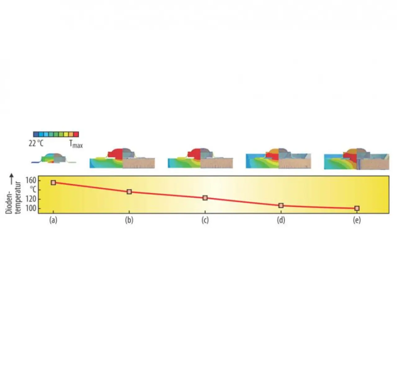 Mit einem FEM-Simulationsprogramm (Finite-Elemente-Methode) wurden die thermischen Verhältnisse einer auf einem einfachen Plattensubstrat montierten Leistungs-LED simuliert. Auf Grundlage dieses Modells erfolgte die Simulation der Auswirkungen von verschiedenen Maßnahmen zur Verbesserung der Kühlleistung (Bild 1). Die Simulationen zeigen, dass durch passive Kühlmaßnahmen die Temperatur der LED von 136 °C auf 102 °C gesenkt werden kann.