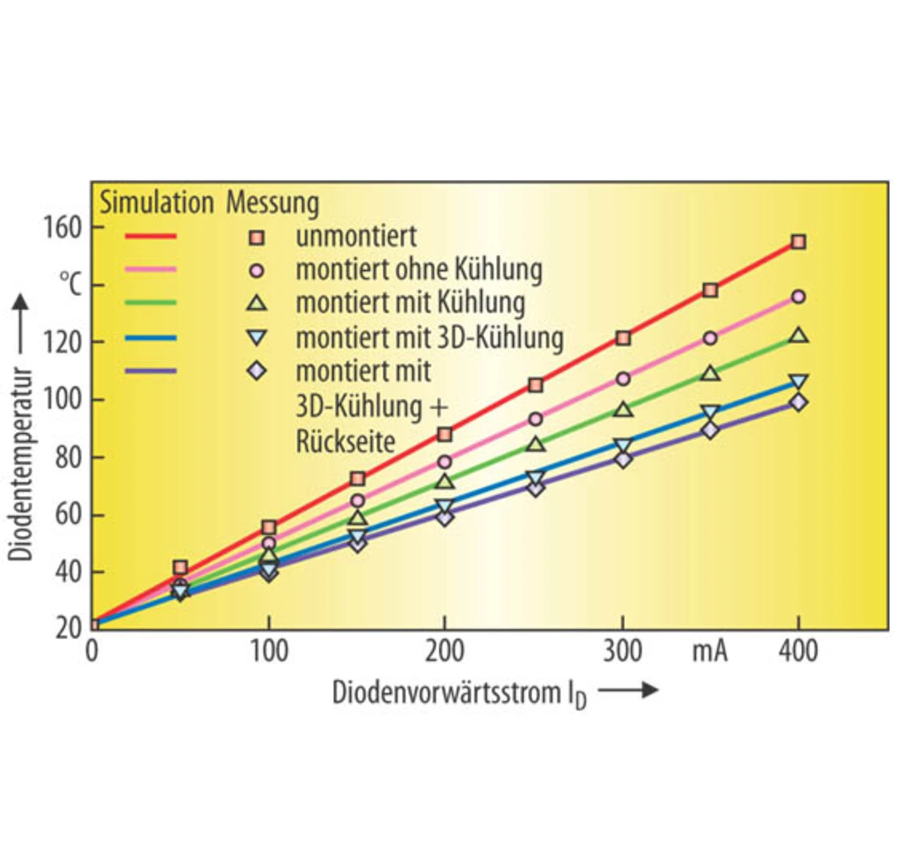 Für alle Kühlszenarien zeigen die Messergebnisse eine gute Übereinstimmung mit den Simulationsergebnissen. Abweichungen von maximal 3 K lassen sich z.B. durch Toleranzen der manuellen LED-Montage erklären.