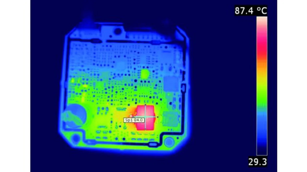 Auch hier gilt es, zahlreiche Aspekte zu prüfen: Beispielsweise, wie das thermische Verhalten der Bauelemente unter Last ist. Wie erwärmen sich die Leistungshalbleiter, wie ist der zeitliche Temperaturverlauf am Bauteil oder auf der Platine unter Volllast? Gibt es kritische Hot Spots, da Bauteile zu eng gesetzt worden sind? Wie hoch wird die Temperatur an den eingelöteten Anschlüssen der Leistungselemente in der Platine und ist sicher gestellt, dass sie sich nicht von selbst auslöten? Bild 6 zeigt einige der hier aufgezählten Beispiele, die sehr einfach mit einer Wärmebildkamera aufgenommen werden können. Aus dem Bild wird zudem ersichtlich, dass ein Bauteil (siehe Sp1) bereits auf ca. 87 °C aufgeheizt ist.