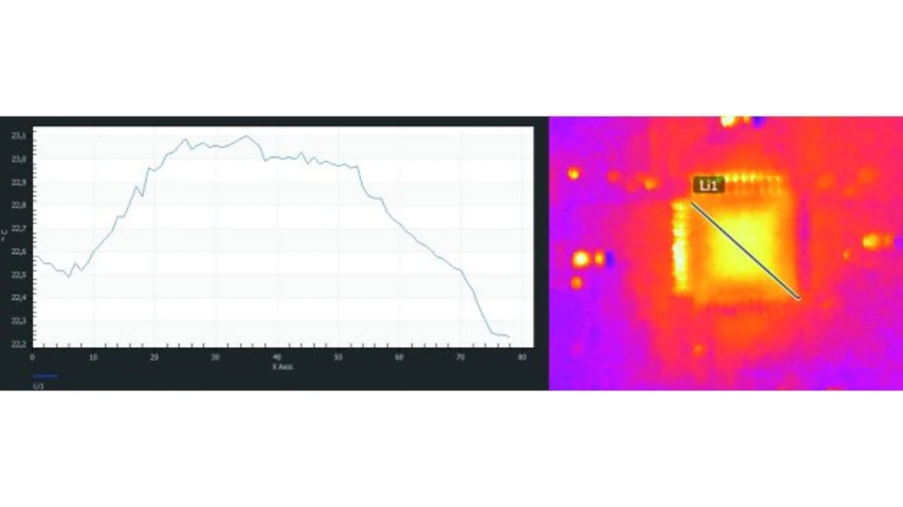 Zu testen ist darüber hinaus, ob bei gegebenen Umweltbedingungen beispielsweise die Funktion eines zu testenden ICs nicht nur im Ruhezustand, sondern auch im Betrieb die thermischen Bedingungen erfüllt. Mit Hilfe der Software zur Wärmebildkamera kann ein Profil der Wärmebelastung des IC unter realen Bedingungen aufgenommen werden. Bild 7 zeigt einen Temperaturverlauf quer über ein IC hinweg. So kann z.B. für einen Prozessor eine Stressbelastung durchgeführt werden, wenn er mit einer fast hundertprozentigen Auslastung beaufschlagt wird.
