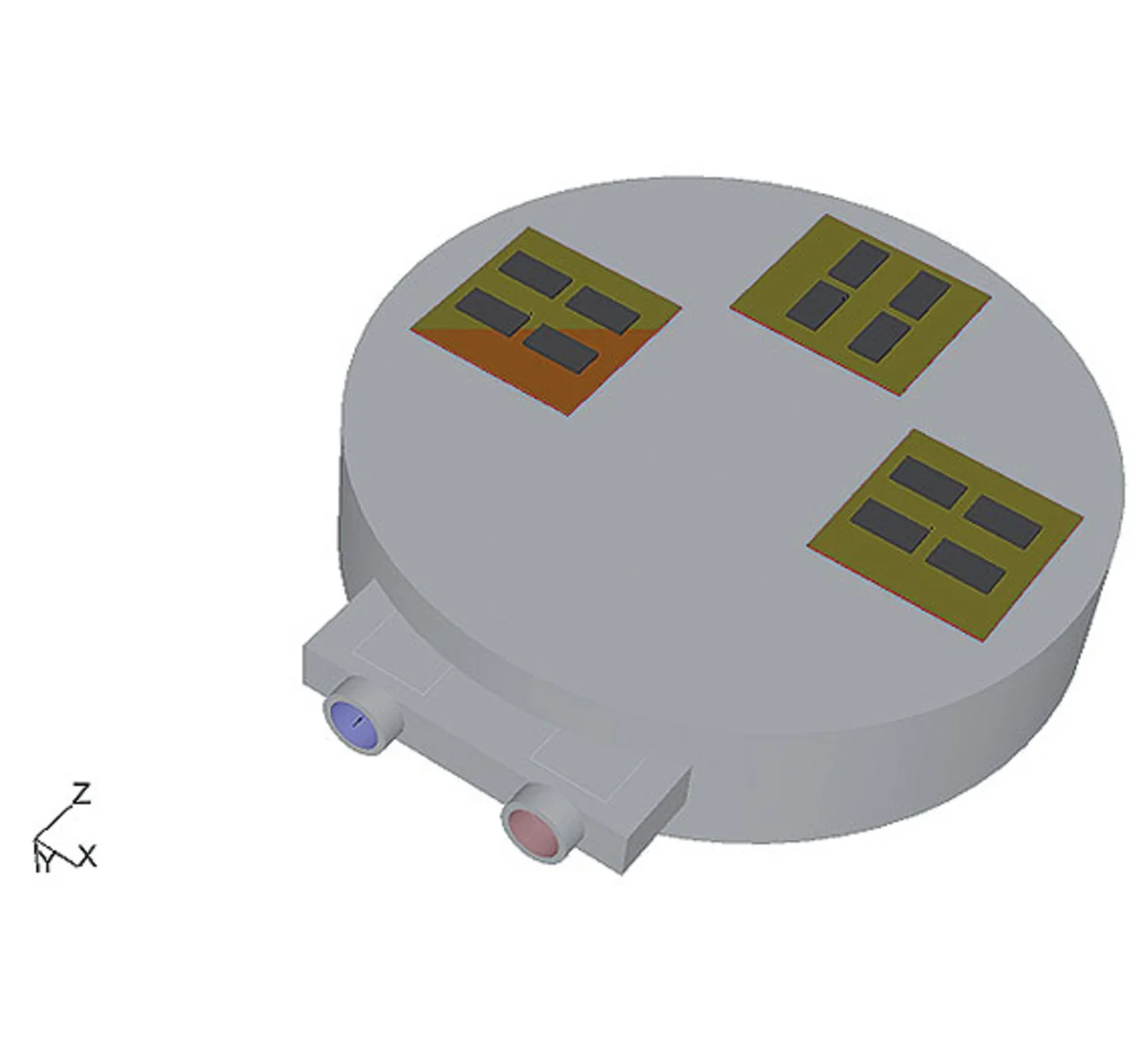 Das folgende typische Beispiel lässt sich in ca. 30 Minuten auf einer zeitgemäßen Workstation definieren und berechnen: Auf dem Dosendeckel sind auf drei getrennten Leiterplatten (Bild 2) insgesamt zwölf IGBT-Module zu je 200 W montiert. Der Kühler steht in 60 °C heißer Umgebung und wird mit 15°C kaltem Wasser/Glykol-Gemisch durchströmt. Darüber hinaus gehen die Pumpenleistung und die Kanalgeometrie als Designparameter in die Berechnung mit ein.