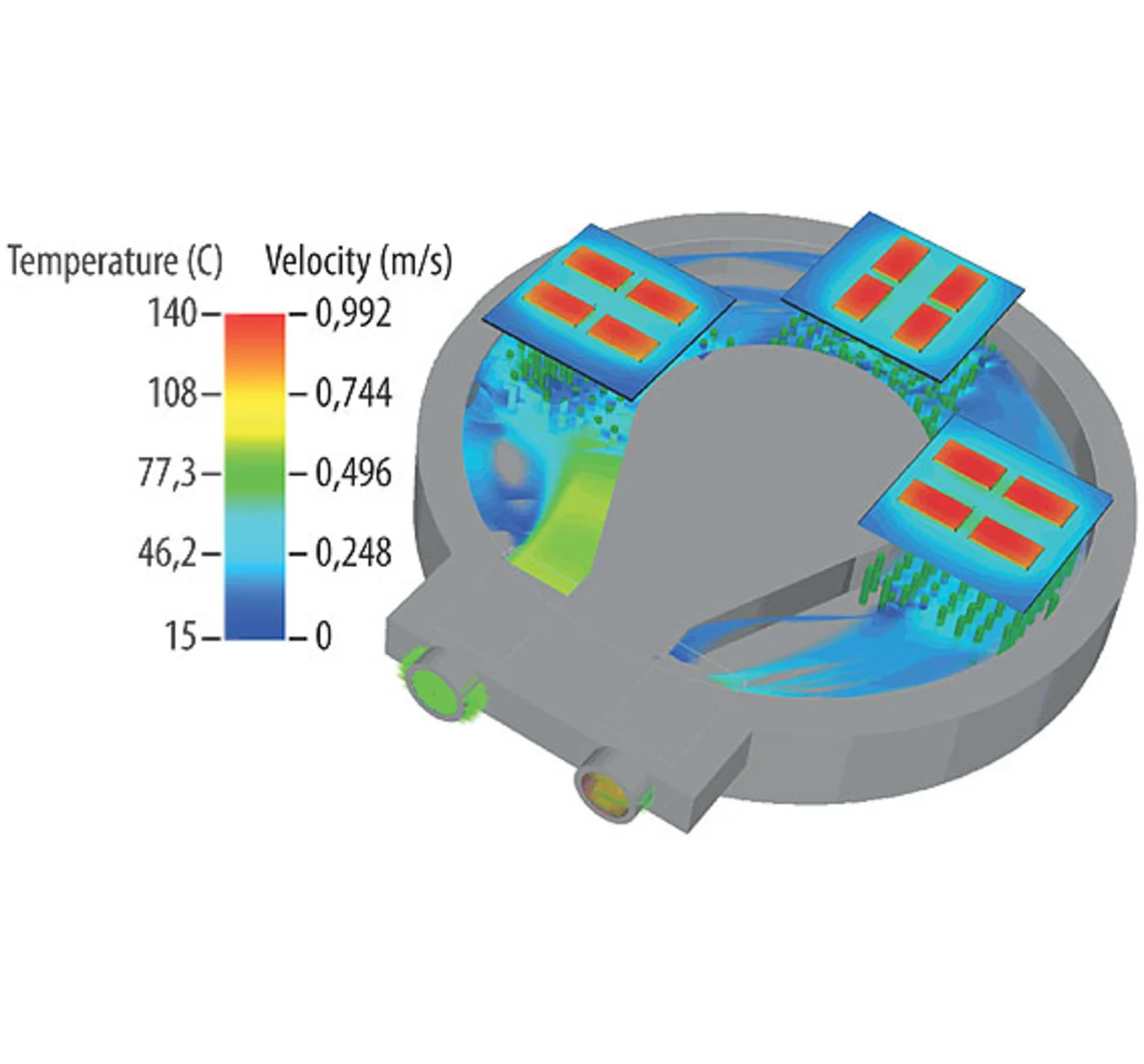 Das Simulationsergebnis, ausgehend von 10 l/min Fließgeschwindigkeit, ist in Bild 3 dargestellt und lässt erkennen, dass die berechnete Bauteiltemperatur bei 140 °C liegt. Da die Rücklauf-temperatur des Wassers nur wenige Grad höher als am Zulauf ist, sind die Stromlinien entsprechend der Fluidgeschwindigkeit eingefärbt worden. Am Einlauf tritt das Wasser strahlartig ein und expandiert dann stromabwärts. Die zylinderförmigen Hindernisse sollen dafür sorgen, dass die Strömung verwirbelt und die nachfließende Wärme der Komponenten schnell abgeführt wird.