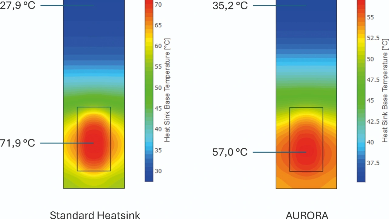Für eine vergleichende Untersuchung wurden ein Standard-Rippenkühlkörper und ein NEOcore-Kühlkörper (Modell Aurora) mit identischen Abmessungen anhand eines Semix-3P-IGBT-Moduls analysiert. Die Simulation zeigte, dass bei der herkömmlichen Lösung die Kühlung auf den Bereich unmittelbar über dem Modul beschränkt bleibt, während der Großteil des Kühlkörpers thermisch inaktiv bleibt. Im Gegensatz dazu verteilt der NEOcore-Kanal die Wärme gleichmäßig über die gesamte Rippenstruktur und aktiviert so die komplette Kühlfläche zur Konvektion.