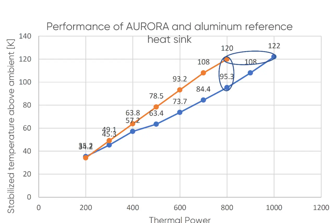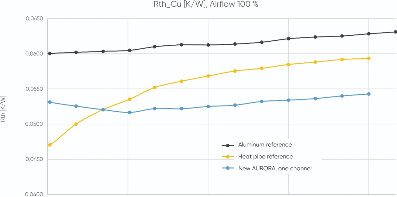 In einem weiteren Vergleich mit einem Kühlkörper, der mit eingebetteten Heatpipes arbeitet, zeigte die NEOcore-Lösung durchgehend bessere Temperaturwerte. Über den gesamten Betriebsbereich hinweg blieb die Kühlkörpertemperatur im Mittel etwa 15 % niedriger. Ab einer Auslastung von etwa 25 % der Nennleistung verlor die Heatpipe-Variante zunehmend an Effizienz, während die NEOcore-Technologie konstant leistungsfähig blieb.