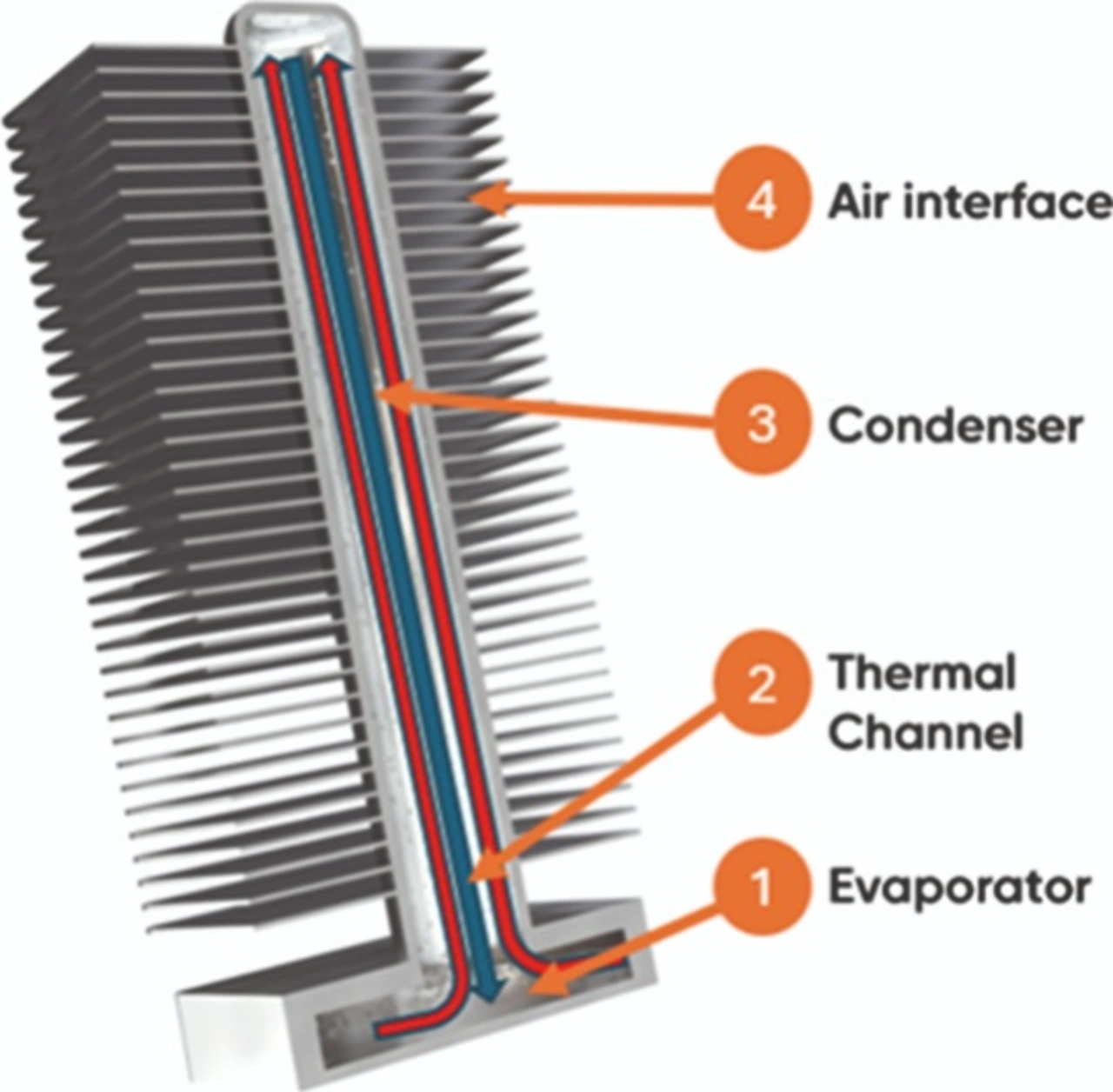 Dieser Kanal nutzt einen Phasenwechselprozess und erreicht eine effektive Wärmeleitfähigkeit von 200.000 W/mK – etwa das 1000-Fache der Wärmeleitfähigkeit von Aluminium. Dadurch lassen sich bis zu 3 kW Verlustleistung pro Modul abführen, auch bei kompakten Bauraumverhältnissen. Die Kühlkörper sind so konstruiert, dass ein großflächiger Verdampfer die Wärmeaufnahme maximiert, während der direkt integrierte Kanal den thermischen Widerstand reduziert. Der nachgeschaltete Kondensationsbereich ermöglicht die Rückverflüssigung des Arbeitsmediums, bevor die abgeführte Wärme an einem optimierten Luftübergang an die Umgebung abgegeben wird.