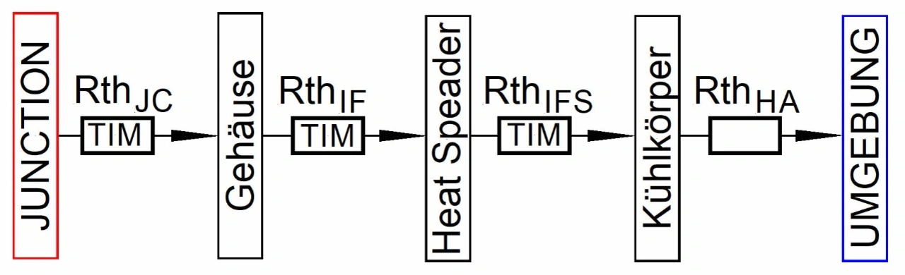 Zwischen Halbleiterkristall und umgebender Luft befinden sich mehrere Materialien, deren Wärmewiderstände, ähnlich wie bei ohmschen Widerständen, in Reihe angeordnet sind und in Summe den gesamten Wärmewiderstand des Kühlsystems bilden.