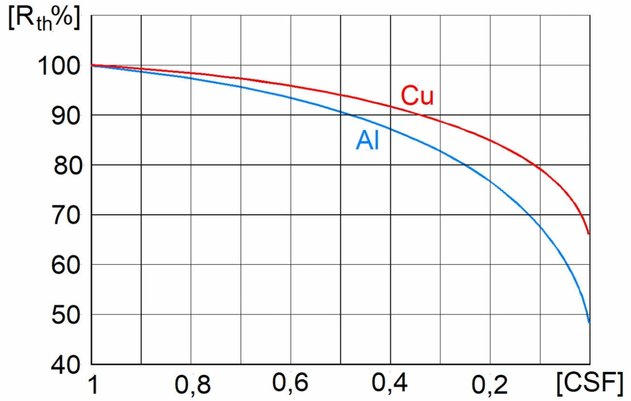 Die zu kühlende Fläche AC ist meist deutlich kleiner als die Koppelfläche des Kühlkörpers AHS. Dadurch verschlechtert sich der Wärmewiderstand des Kühlkörpers. Die tatsächlich zu kühlende Fläche und Lage des zu kühlenden Bauteils am Kühlkörper sind individuell bestimmt und müssen berücksichtigt werden. Meist ist der Platz in der Höhe sehr begrenzt, so dass der Kühlkörper nur in der Fläche, parallel zur PCB, ausgedehnt werden kann. Aluminium, das für Kühlkörper aus Peis- und Gewichtsgründen fast ausschließlich verwendet wird, hat nur mittleren Wärmeleitwert. Daraus folgt, Kühlrippen oder -Stifte, die weiter weg von der (metallischen) Gehäuseoberfläche des Halbleiters entfernt liegen, tragen wegen des internen Wärmewiderstandes des Kühlkörperbodens weniger zur Wärmeabgabe bei. Der Cooling Surface Factor (Kühlflächenfaktor) ist das Verhältnis der Kühlfläche zur Koppelfläche des Kühlkörpers CSF = AC / AHS. Ein Richtwert des Korrekturfaktor für den Kühlkörper kann aus dem Diagramm Rth in Abhängigkeit von CSF ermittelt werden.