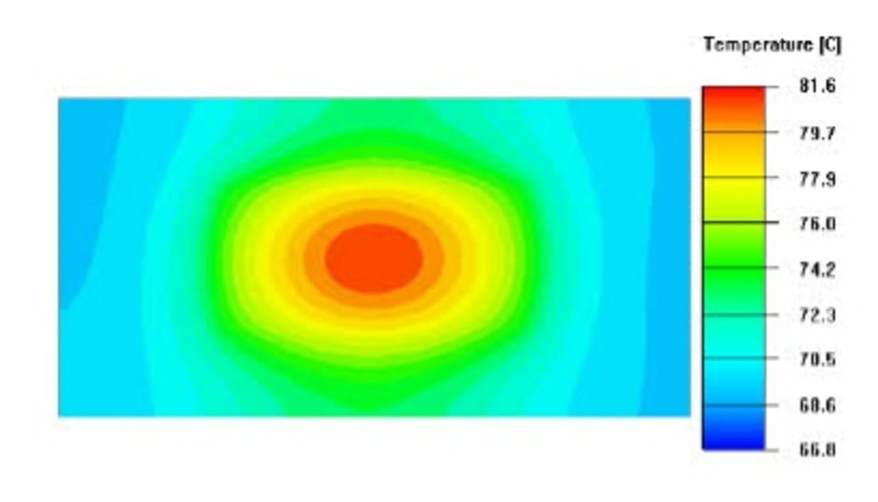 Der Wärmewiderstand des untersuchten Kühl-Systems, einschließlich Interface, ist dann: RthHA = (THI-TA) / PR [K/W]. Da die tatsächliche Umgebungs-Endtemperatur in einem geschlossenen Gerät deutlich über der Raumtemperatur bei der Messung liegen wird, ist die im eingebauten Zustand erlaubte maximale Verlustleistung des elektronischen Bauteils niedriger als die bei der Systemmessung eingekoppelte Leistung. Die Kontrollrechnung mit einer realistisch anzunehmenden Umgebungstemperatur im Geräteinneren TAINmax und dem ermittelten Wärmeübergangswiderstand des Kühlsystems ergibt die maximal Verlustleistung des Halbleiters PJ, die abgeführt werden kann, ohne dass der Chip überhitzt wird: PJmax = (THI – TAINmax) / RthHA [W] (oft wird eine maximale Umgebungstemperatur TAINmax im Geräteinneren von 40°C angenommen).