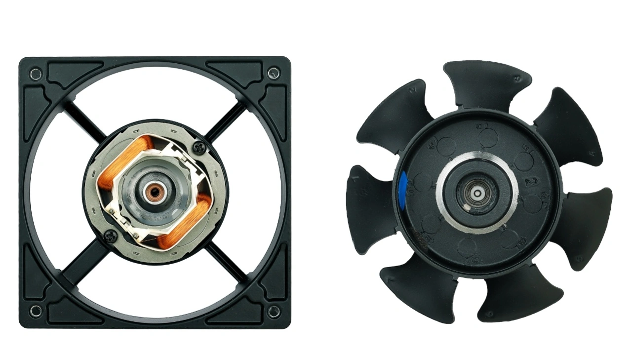 Der EC-Lüfter in dieser Abbildung (Bild 2) ist von einem DC-Lüfter nicht zu unterscheiden. Er hat eine innen liegende vierpolige Statorwicklung. Darunter sind, wie bei einem Gleichstromlüfter, die Kommutierungselektronik und auf der Rückseite der Leiterplatte auch der AC-DC Wandler untergebracht ist. Rechts daneben, im Rotor befindet sich ein vierpoliger Magnetring aus Kunststoff.