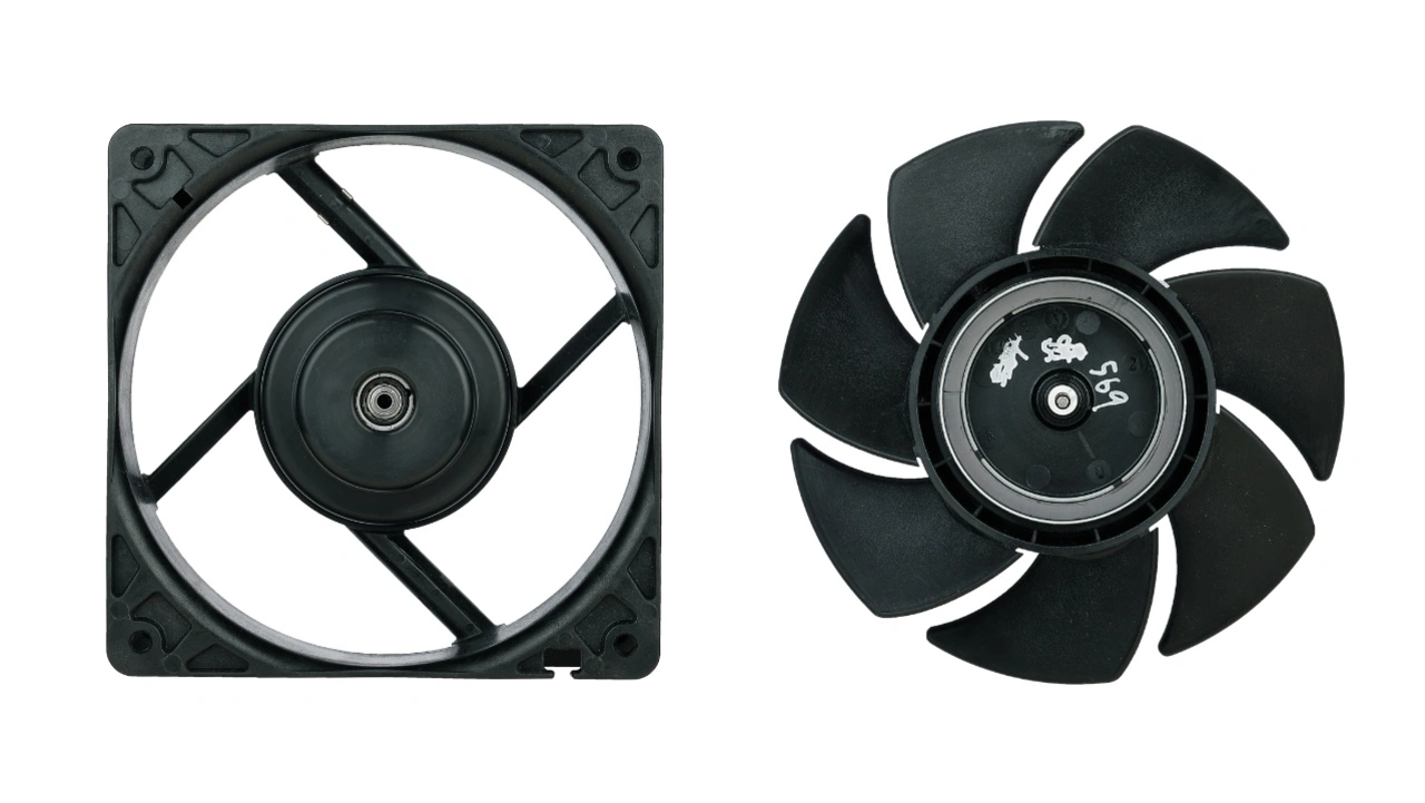 Die Abbildung (Bild 1) zeigt einen herkömmlichen AC-Lüfter der Größe 120x120x38mm. Er enthält einen Asynchronmotor mit einer außen liegenden Statorwicklung. Im abgebildeten Rotor befindet sich ein innenliegendes Blechpaket. Diese Konstruktion nennt man Kurzschlussläufer.