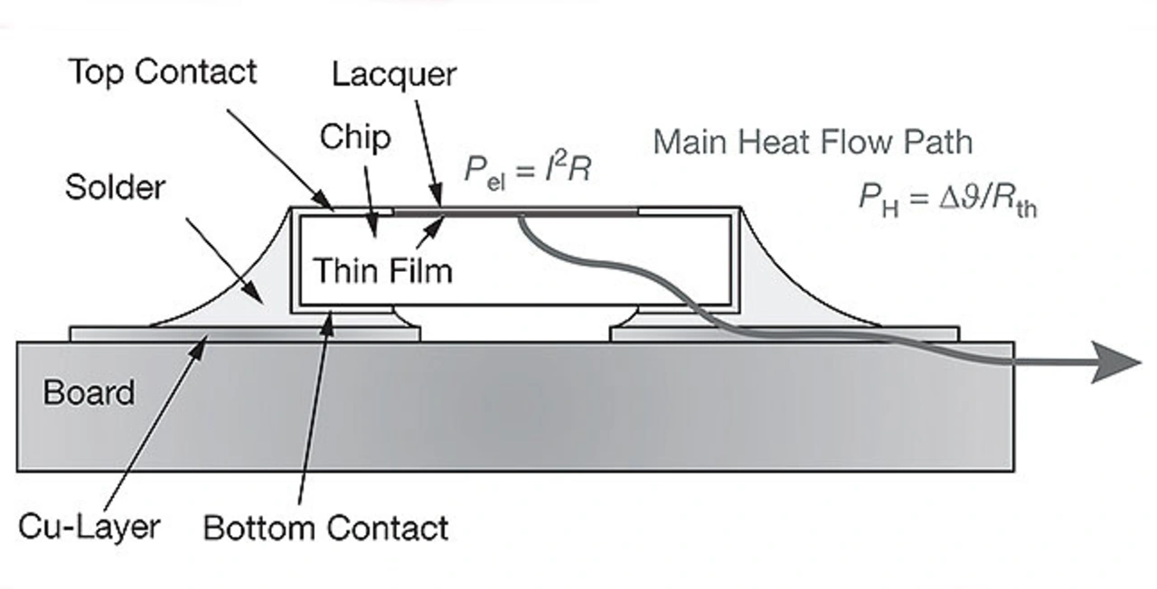 Elektrische Widerstände führen ihre Verluste (I2·R) als Wärme ab, wodurch deren Temperatur steigt. Sobald ein Temperaturgefälle entsteht, beginnt Wärme zu fließen. Nach einer gewissen Zeit – abhängig von der Wärmekapazität und den Wärmeleiteigenschaften der Komponente – wird ein stationärer Zustand erreicht. Der konstante Wärmestrom PH entspricht der abgeleiteten elektrischen Leistung Pel (Bild 1).