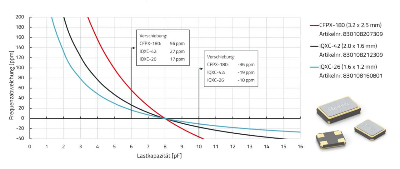 Abbildung 2 veranschaulicht die Ziehempfindlichkeit und den Einfluss einer falsch ausgelegten Lastkapazität. Beispielhaft wurden hier drei Quarze in unterschiedlichen Bauformen gewählt. Abgesehen von der Baugröße ist die Spezifikation hinsichtlich Frequenz (24 MHz), Toleranz (±10 ppm) und der Lastkapazität (8 pF) identisch. Die eingezeichneten Kurven zeigen die Ziehempfindlichkeit. Entspricht nun die Lastkapazität der Schaltung der des Quarzes (also 8 pF), ergibt sich keine zusätzliche Frequenzabweichung: Der Quarz schwingt auf seiner Sollfrequenz.