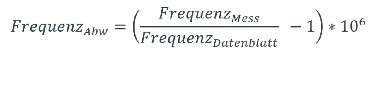 Entsprechend der gemessenen Frequenz im Vergleich zur Sollfrequenz laut Datenblatt lässt sich die Abweichung einfach berechnen (Formel nebenstehend):