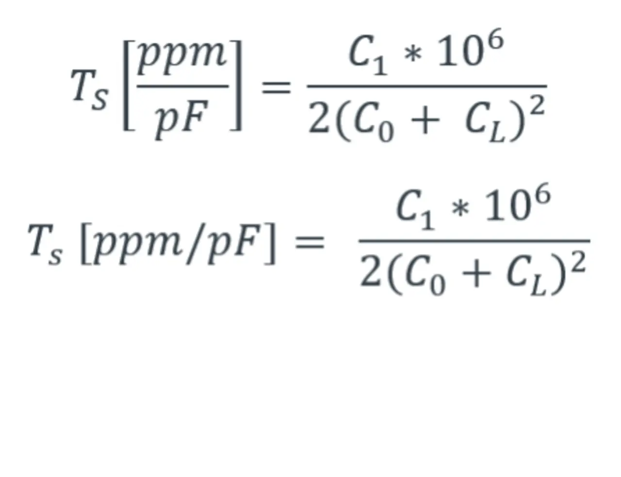 Ist die Lastkapazität der Schaltung falsch ausgelegt, hat das einen direkten Einfluss auf die Frequenztoleranz des Quarzes. Wie groß dieser Einfluss ist, gibt die sogenannte Ziehempfindlichkeit (engl. Trim Sensitivity) TS an: