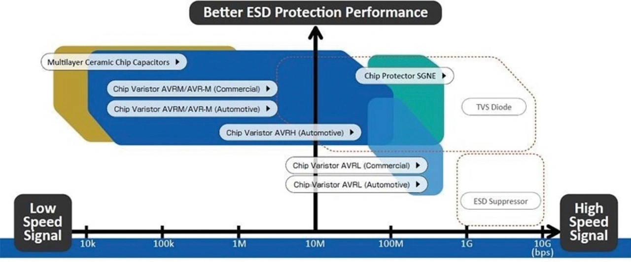 Wie das Diagramm in Bild 3 zeigt, decken MLVs einen breiteren Anwendungsbereich ab als TVS-Dioden und sind sowohl in Ausführungen für den gewerblichen als auch für den Automobilbereich erhältlich. Die folgenden Überlegungen können Entwicklern helfen, detaillierter zu vergleichen.
