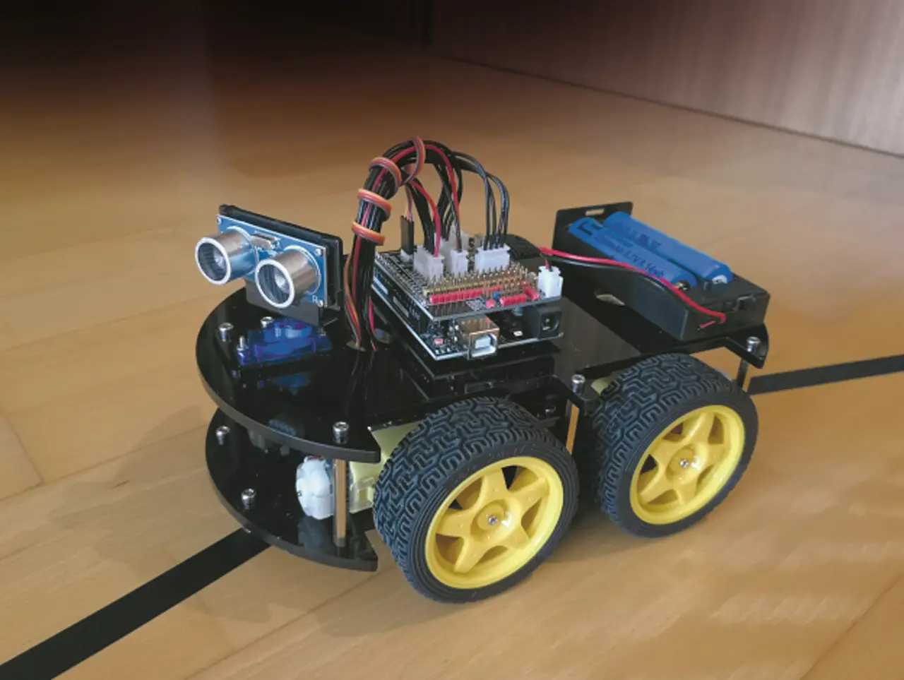 Fahren ohne Auffahrunfall funktioniert schon ganz gut. Jetzt soll unser neuer Freund noch einen Trick lernen. Dazu widmet sich Lektion 3 der Linienverfolgungsfunktion des Smart Robot Cars. Schnell mit schwarzem Klebeband ein Parcours auf den Boden aufgeklebt und schon kann es losgehen. Am liebsten hat unser Roboter Kreisbahnen; Winkel sind aber auch erlaubt – solange sie nicht zu klein sind. Sonst kann es passieren, dass der Roboter die Spur verliert.