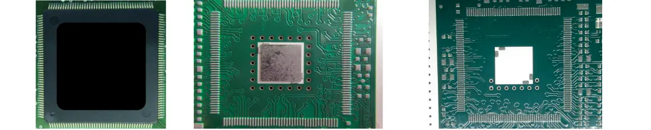 Die LV-Preform wurde im SMT-Pick&Place-Prozess an die vorgegebene Position des Thermo-Pads auf der Leiterplatte bestückt. Anschließend erfolgt die Platzierung der Komponente (LQFP), welche im Standard-Reflow-Lötprozess verarbeitet und gelötet wird. Dazu benötigt man keine Sonderabläufe im Bestück- und im Reflow-Lötprozess. Als Antwortgröße der Aufbauten wurde wiederum eine Röntgenanalyse zur Ermittlung der Void-Anteile in Prozent der Pad-Fläche durchgeführt.