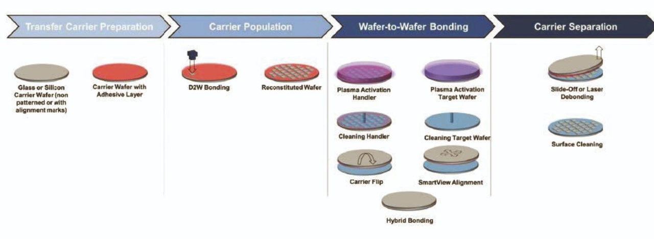 Ein hybrides D2W-Bonding-Verfahren, das bereits seit einigen Jahren in der Massenproduktion für Anwendungen wie Silicon-Photonics eingesetzt wird, ist Collective Die-to-Wafer-Bonden (Co-D2W). Beim Co-D2W-Bonden werden vereinzelte Dies über einen Trägerwafer auf den endgültigen Wafer übertragen und in einem einzigen Prozessschritt gemeinsam gebondet. Der Fertigungsablauf für das Co-D2W-Bonden ist in Bild 1 dargestellt und besteht aus vier Hauptabschnitten: Trägervorbereitung, Trägerbestückung, Wafer-Bonden (temporär und permanent) und Trägerabtrennung.