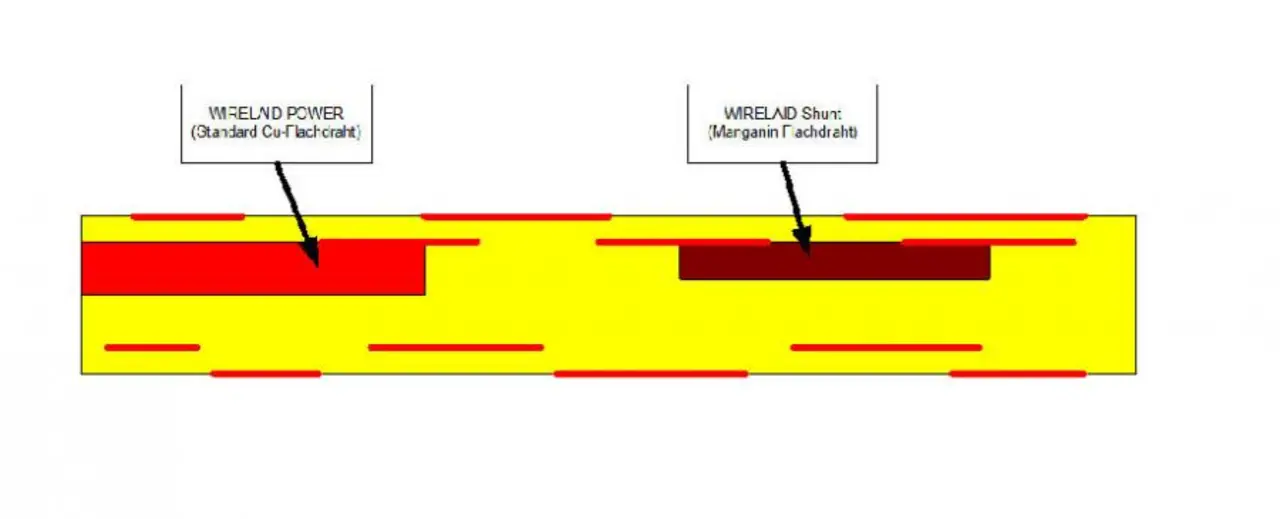 Eine weitere Innovation steht den Anwendern künftig mit der Variante Wirelaid Shunt (Bild 2) zur Verfügung, bei der in die Leiterplatte hochpräzise Manganin-Widerstandsdrähte integriert werden. Vias, die bis dato die Leistungs-Leiterzüge aus Innenlagen an die Außenlagen herausführten, um sie dort mit den (in niederohmigen Bereichen sehr teuren) diskreten SMD-Messwiderstanden zu verbinden, dürften damit der Vergangenheit angehören. Lediglich Abgriffstellen, über die Messungen am Wirelaid Shunt durchgeführt werden, sind weiterhin vonnöten.