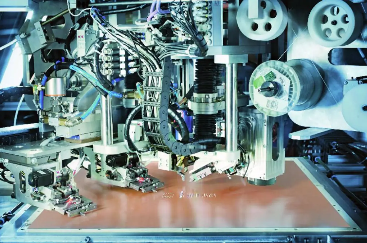 Die Kupferfolie wird auf dem Vakuumtisch des Automaten fixiert. Über Kennlöcher werden Position und Lage der Folie optisch registriert. Die erste Schweißposition wird angefahren, und über die kontrollierte Z-Achse werden Niederhalter und Schweißelektrode aktiviert. Der Maschinentisch fährt die zweite Schweißposition an. Dabei wird der Draht aktiv nachgeführt und in der Sollposition niedergehalten, geschnitten und verschweißt. Die Gegenelektrode befindet sich dabei stationär unter der Kupferfolie (Bild b).