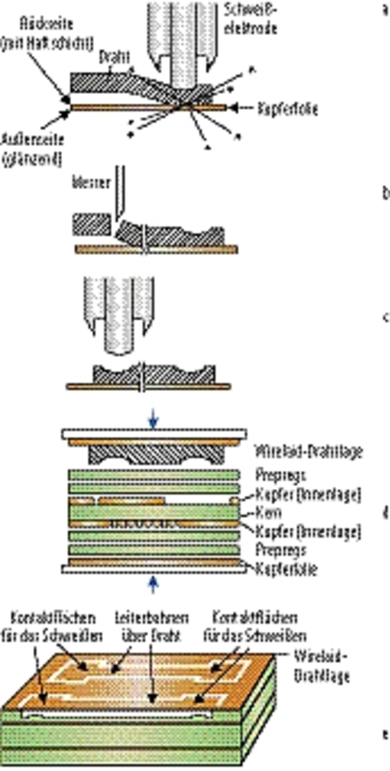 Alle Arbeitsschritte, einschließlich der Drahtzuführung von Standardspulen, laufen vollautomatisch auf einem CNC-gesteuerten Automaten ab (Bild a). Eine Vorbehandlung der Fügepartner, Kupferfolie und versilberter Kupferdraht, ist dabei nicht erforderlich. Der Wirelaid-Automat kann alle gängigen Kupferfolien-Formate der Leiterplattenhersteller verarbeiten.