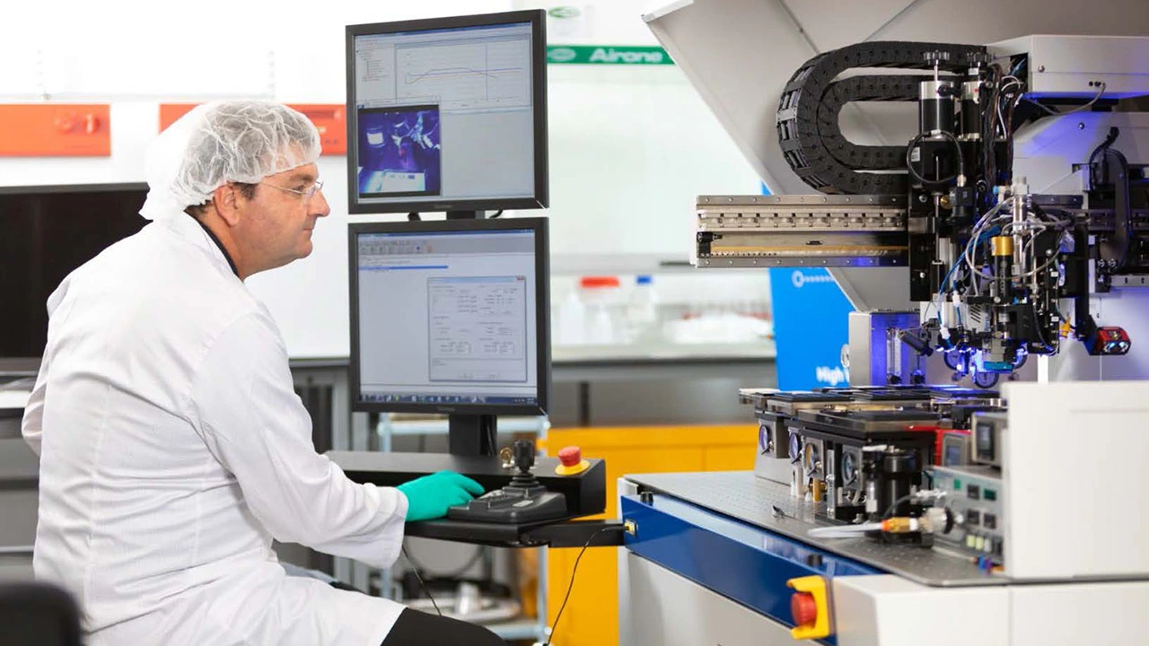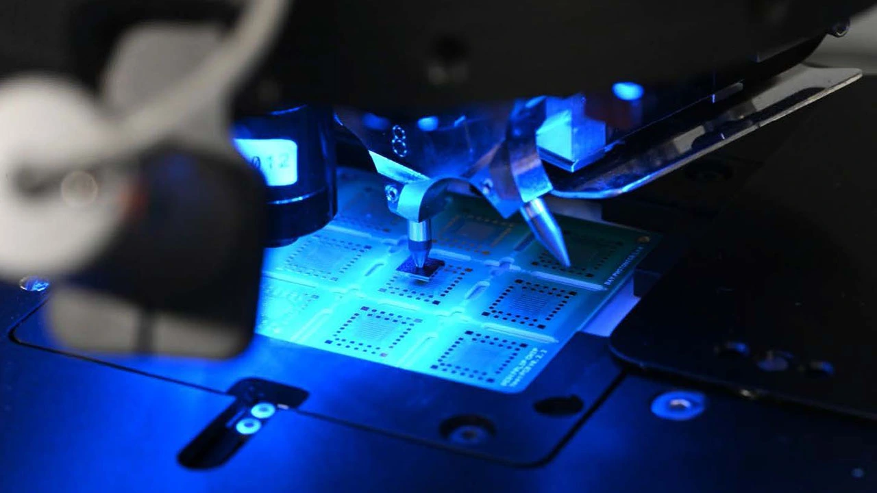 Hochpräzise Montage in Aktion: Ein automatischer Die-Bonder richtet Halbleiterkomponenten präzise aus und platziert sie für die Verpackung von Photonik-Bauteilen.