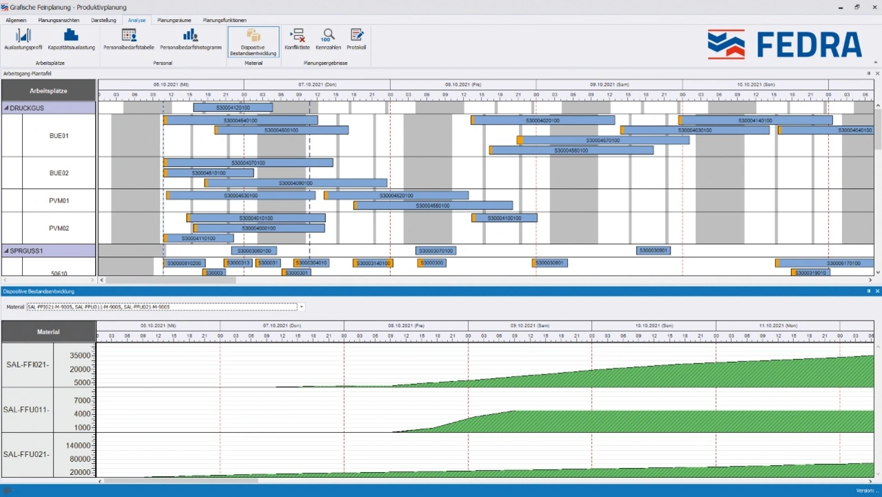 Die moderne Feinplanung kann neben den klassischen Ressourcen aber auch sogenannte Verbrauchsressourcen in den Planungsprozess einbeziehen. Dazu gehören zum Beispiel das Material und die unterschiedlichsten Formen von Energie. Insbesondere in einer mehrstufigen Fertigung entstehen enorme Vorteile, wenn die aktuellen Materialbestände in der Planung berücksichtigt werden. Dies gilt nicht nur für das Rohmaterial, sondern insbesondere für die WiP-Bestände (Work in Progress), die beim Herstellen von Halbzeugen entstehen. Werden die Materialbestände in der Feinplanung berücksichtigt, können unnötige Wartezeiten aufgrund fehlender Teile bereits vor dem Start des jeweiligen Produktionsschritts erkannt und rechtzeitig Gegenmaßnahmen ergriffen werden.