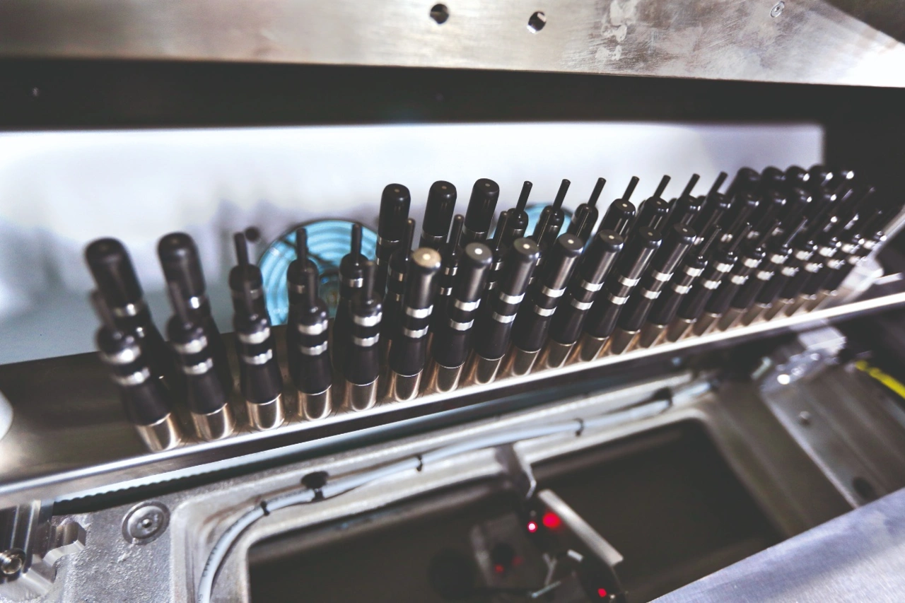 Wer sich für das Zusatz-Feature Smart Pin Placement entscheidet, kann ebenfalls mit weniger manuellen Eingriffen produzieren. Dabei werden Unterstützungs-Pins (4 mm und 12 mm Durchmesser) programmgesteuert und voll automatisch gesetzt. Beim »DEK TQ L« fasst das Magazin bis zu 60 Pins. Ein Novum und essenzielles Feature in der Branche: Nach dem Setzen der Pins wird automatisch die Pinhöhe und -position verifiziert. So lässt sich verhindern, dass ein einzelner Pin die gesamte Baugruppe beschädigt, weil er beispielsweise aufgrund von Verschmutzungen auf dem Tisch minimal erhöht steht.