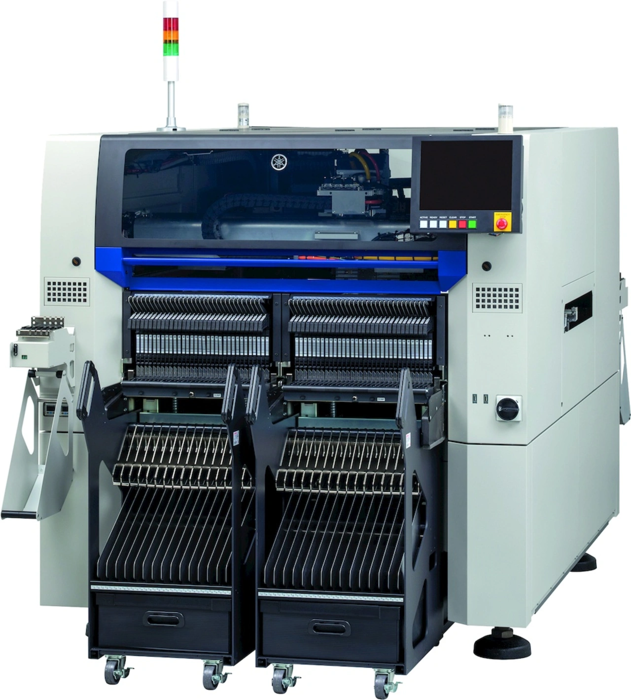 Für eine datengesteuerte Fertigung hat Yamaha eine neue Maschinensteuerung entwickelt, die u. a. in Fertigungsmaschinen der YR-Serie integriert wird. Zu denen gehören auch die YRM20-Bestücker für Leiterplatten von 50 mm x 50 mm bis 810 mm x 490 mm. Sie wurden laut Hersteller bei den Aspekten Fertigungsgeschwindigkeit, Positioniergenauigkeit und Benutzerfreundlichkeit verbessert und erreichen unter optimalen Bedingungen die beachtliche Bestückungsrate von 115.000 Bauteilen pro Stunde. Ein neu entwickelter RM-Rotationskopf ermöglicht das Bestücken von kleinen 0201-Chips bis hin zu großen Chips 12 mm x 12 mm ohne Kopfwechsel, sodass sich Umrüstzeigen verkürzen. Weitere Funktionen sind ein Non-Stop Tray Handler und ein Hochgeschwindigkeits-Feeder.