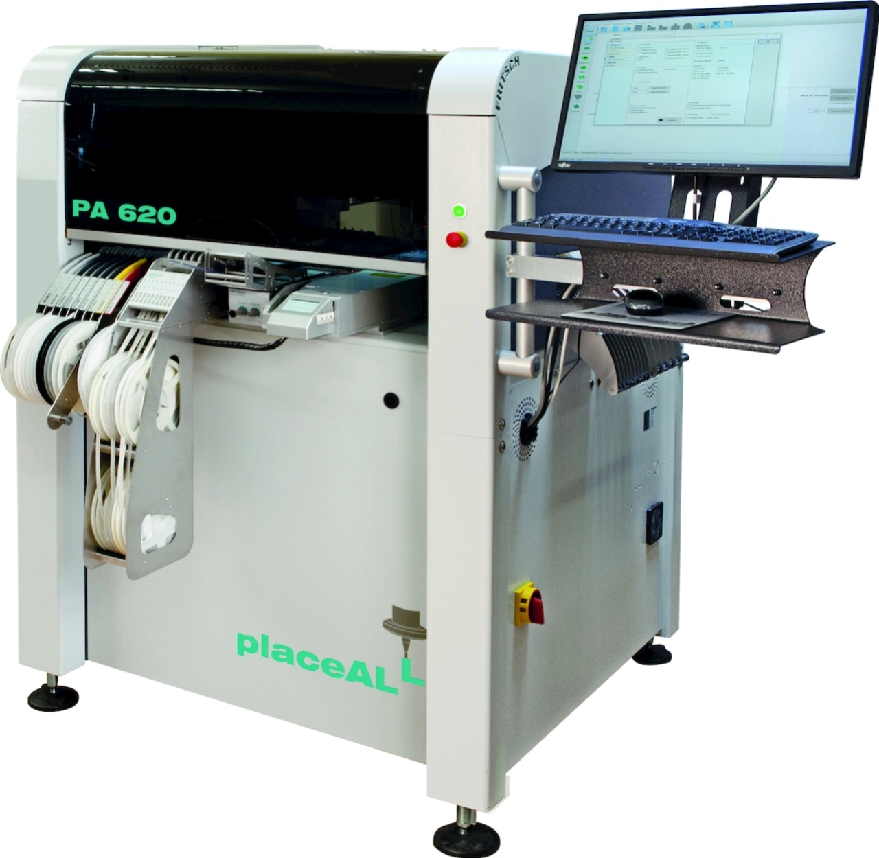 Bei der Baugruppenfertigung in Kleinserien sind kurze Rüstzeiten besonders relevant. Erreichen lassen sie sich bei Bestückern dadurch, dass viele Feeder integriert sind und so eine große Menge und große Vielfalt von Teilen vorgehalten wird. Der placeALL 620 von Fritsch wird von 208 Feedern befüllt und kann mit Teilen aus Gurt, Stange, Gurtabschnitt, Tray und Schüttgut arbeiten. Die Bestückleistung von 6000 Bauteilen pro Stunde lässt sich mit einem zweiten Bestückkopf auf 10.500 pro Stunde erhöhen. Benötigt werden dafür 2,0 m x 1,5 m Standfläche. Als Erweiterung wurde ein neues Inline-System mit Flachbandriemen und motorischer Breitenverstellung für Leiterplatten mit einer Größe bis 450 mm x 300 mm entwickelt. Die Bandstrecken gibt es in der Ausführung Batch (links/rechts) oder drei Zonen Durchlaufsystem. Die Einbindung in eine Fertigungslinie geschieht über eine SMEMA-Schnittstelle.