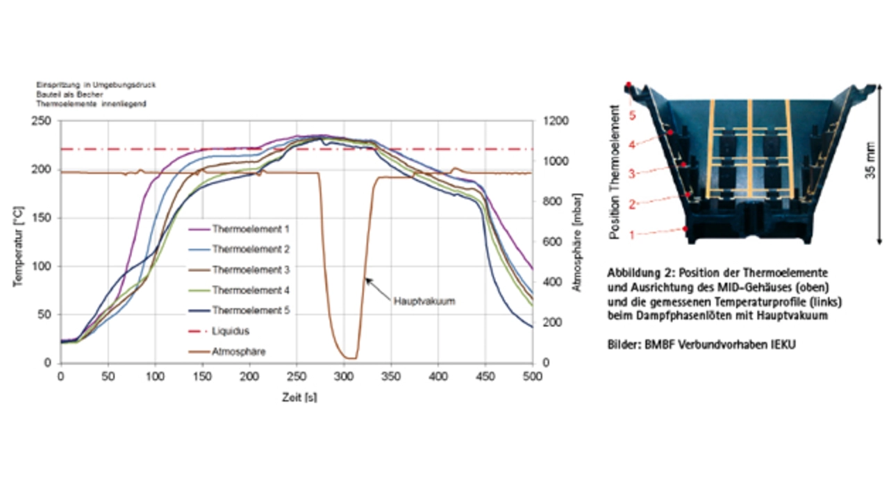 Durch die Anwendung des Dampfphasenlötens in Kombination mit Vakuum lassen sich neben der Reduktion der Void-Anteile auch geometriebedingte Abweichungen der Temperaturprofile beheben. Wie am Beispiel der Temperaturprofilmessungen an einem MID-Gehäuse gezeigt, konnte durch das Vorvakuum eine deutliche Annäherung der Aufheizgradienten an allen Messstellen erreicht werden, und das vom Dampfphasenlöten bekannte kleine Delta T bei der Peaktemperaturen wurde beibehalten. Außerdem kann die Anwendung des Vorvakuums zu einem schnelleren und gleichmäßigeren Aufheizen von Baugruppen mit größeren thermischen Massen angewendet werden. Zusammenfassend lässt sich daraus schließen, dass das Vakuum beim Dampfhasenlöten einen zusätzlichen und sehr flexiblen Einflussparameter zur Evaluierung eines optimalen Lötprofils bietet und darüber hinaus eine Galdenverschleppung bei Bauteilen mit Bechergeometrie verhindert. (zü) ■