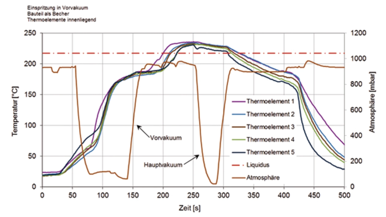 Im nächsten Untersuchungsschritt wurde der Versuch bei gleicher Bauteilausrichtung und Fühlerposition unter Anwendung des Vorvakuums wiederholt. Gleich zur Beginn des Lötprozesses wurde ein Vorvakuum von 100 mbar aufgebaut und das Galden eingespritzt. Die in Abbildung 3 dargestellten Messergebnisse zeigen beim Dampfphasenlöten unter Vakuum eine deutlich gleichmäßigere Temperaturentwicklung an verschiedenen Bauteilpositionen, die einen gleichmäßigen Übergang über den Liquiduspunkt bei unterschiedlichen Bestückhöhen ermöglicht.