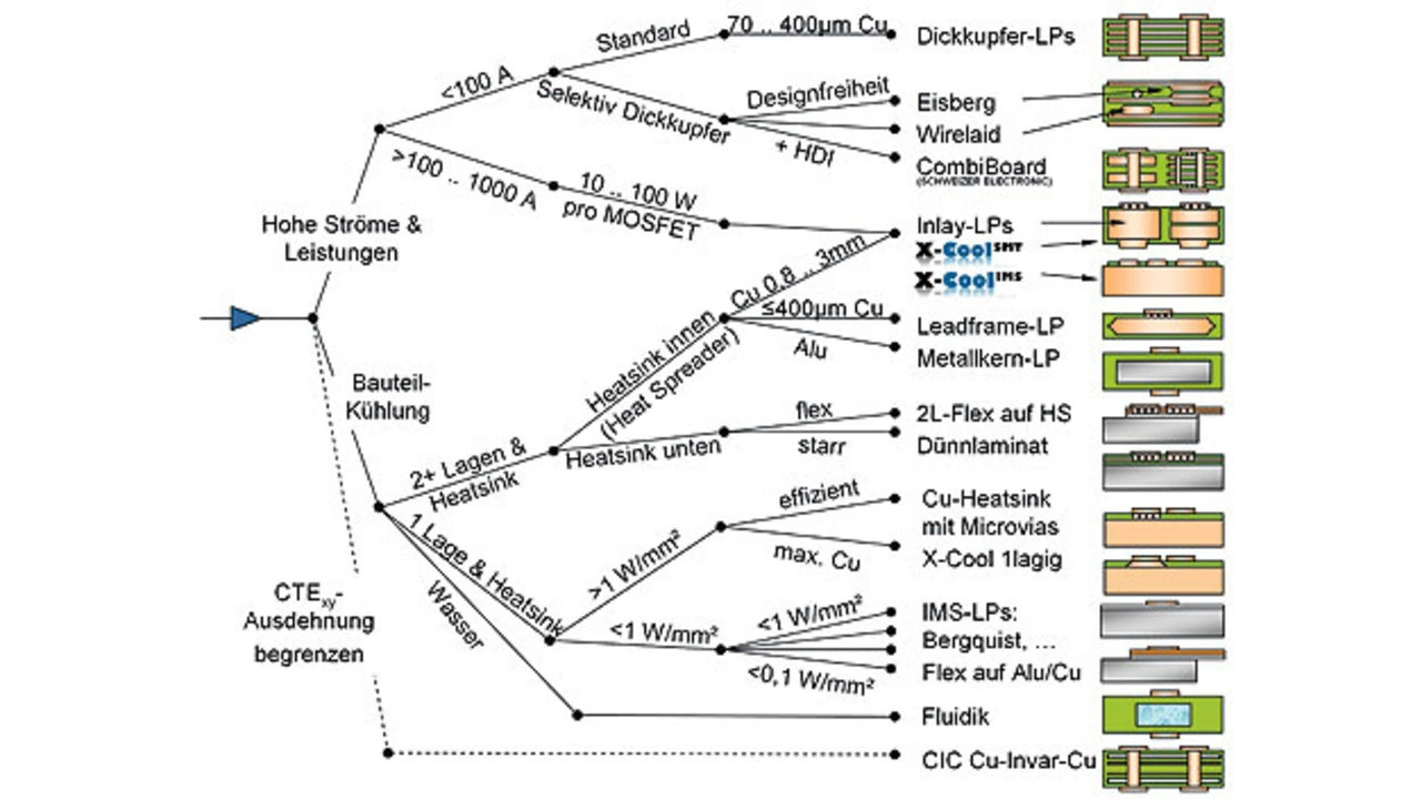 Ein Technologievergleich per Kosten-Nutzen-Analyse bringt ein starkes Missverhältnis in den von den Herstellern veröffentlichten Bewertungen zum Vorschein. Schon aus der Zahl der Fertigungsschritte lässt sich erahnen, dass Technologie A erheblich aufwändiger zu produzieren ist als Technologie B. Zusätzlich zeigt sich, dass die einfachere Technologie B thermisch und mechanisch zuverlässiger ist. Lediglich bei schnellen Temperaturwechseln und großflächigen Bauteilen wirkt sich die hohe Ausdehnung des Aluminiums negativ auf die Zuverlässigkeit aus. Um derartige Fallen zu erkennen und zu vermeiden, ist ein schneller und umfassender Überblick über die verfügbaren Technologien im Bereich Power-Leiterplatten notwendig. Dieser Überblick in Form eines Technologie-Scout (Bild 2) zeigt die Optionen im Technologiedschungel auf und definiert grob die Richtungen, in die die Reise der Elektronikentwicklung gehen kann.