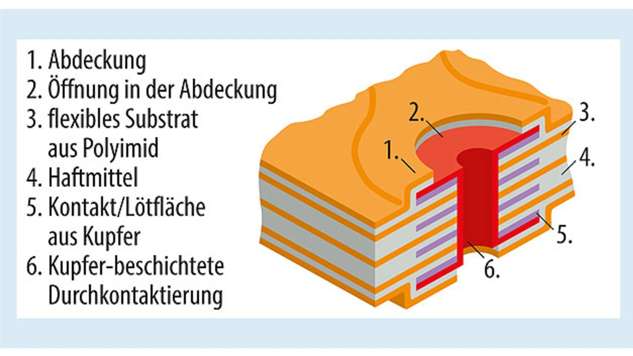 Flexible Leiterplatten können ein- oder doppelseitig oder als Multilayer – für HDI (High Density Interconnect) – gefertigt werden. Diese mehrlagigen Flex-Leiterplatten werden aus mehreren ein- oder doppelseitigen flexiblen Leiterplatten gebildet, die durch Isolierschichten getrennt übereinander gestapelt und verbunden werden. Elektrische Verbindungen zwischen den Ebenen des Multilayers werden über Durchkontaktierungen hergestellt (Bild 1), so entsteht ein zusammengesetztes, miteinander verbundenes System.