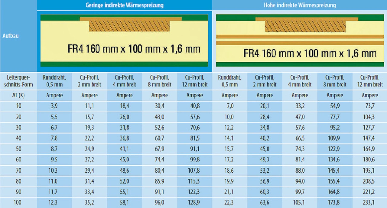 Der Lösungsansatz mit HSMtec geht weit über die Wirkung normaler Masselagen in Multilayern hinaus, weil sich die massiven Kupferelemente additiv zu den Hochstromwegen in die jeweiligen Lagen einarbeiten lassen. Möglichst viel und richtig angeordnetes passives Kupfer beeinflusst die Stromtragfähigkeit der eigentlichen, stromführenden Bahnen jedoch äußerst positiv, da die Verlustleistung und Wärme innerhalb der Leiterplatte zusätzlich gespreizt werden kann. Ein Beispiel macht dies deutlich: Die Stromtragfähigkeit einer Leiterbahn verdoppelt sich annähernd, wenn zwei Masse-Innenlagen darunter liegen, die keine Eigenerwärmung haben (siehe Tabelle).