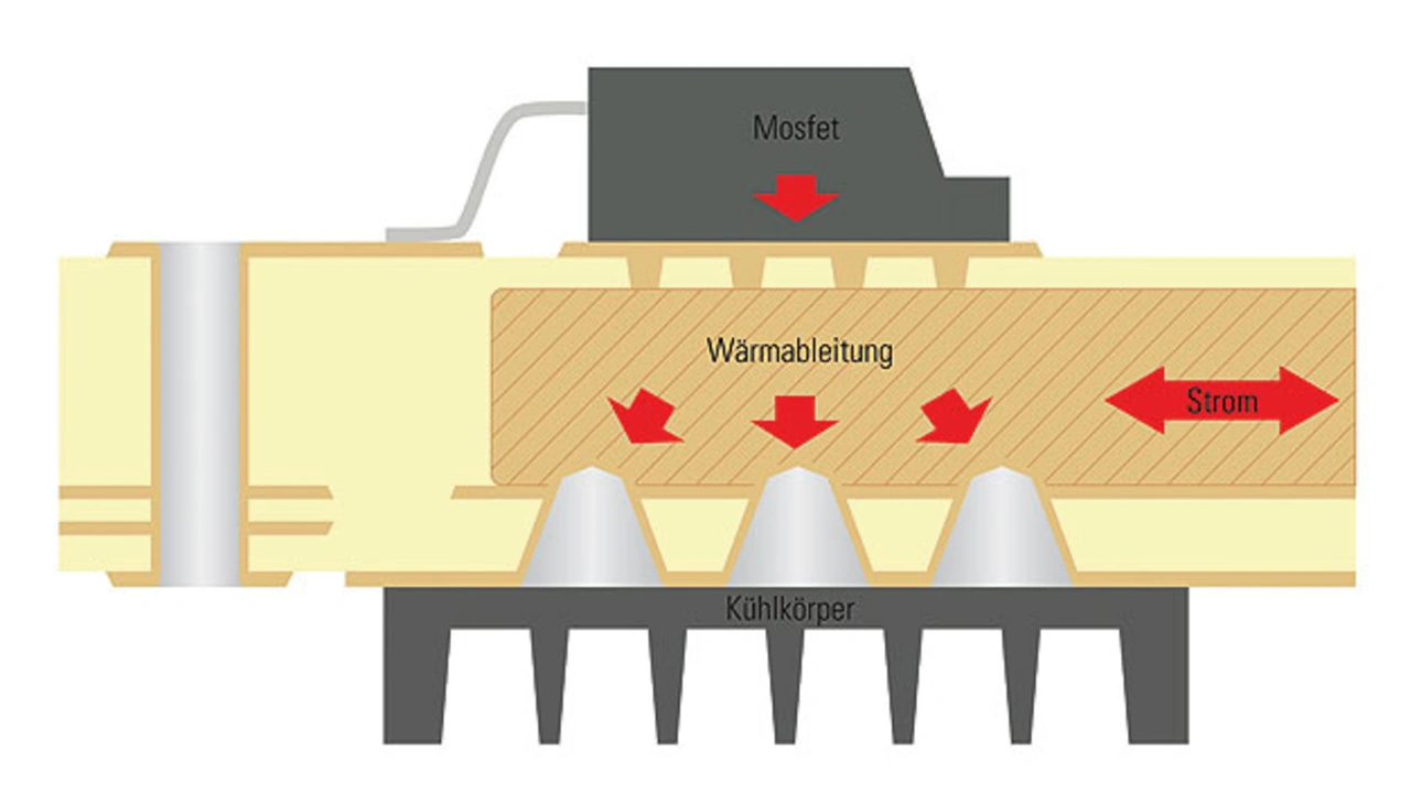Mit Microvias und Thermovias lassen sich die Kupferprofile mit einem Kühlkörper verbinden. Hierbei sind Leiterbreiten, Restringe und Aspect Ratio einzuhalten, sodass eine genügend große Menge Kupfer abgeschieden wird. In der Bohrung muss die Kupferschicht etwa 20 µm dick sein.